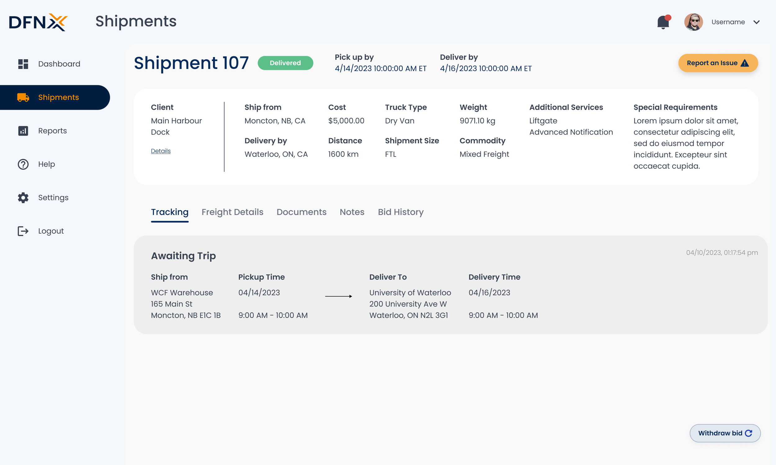DFN Freight needs a dashboard for carriers who can post bids for their shipments. The dashboard should allow carriers to place bids, confirm bids, and monitor orders. They currently have an existing dashboard designed for the shippers side. We are tasked with creating only the carrier side of the dashboard. There are also two users for this product: the carriers and the shippers.