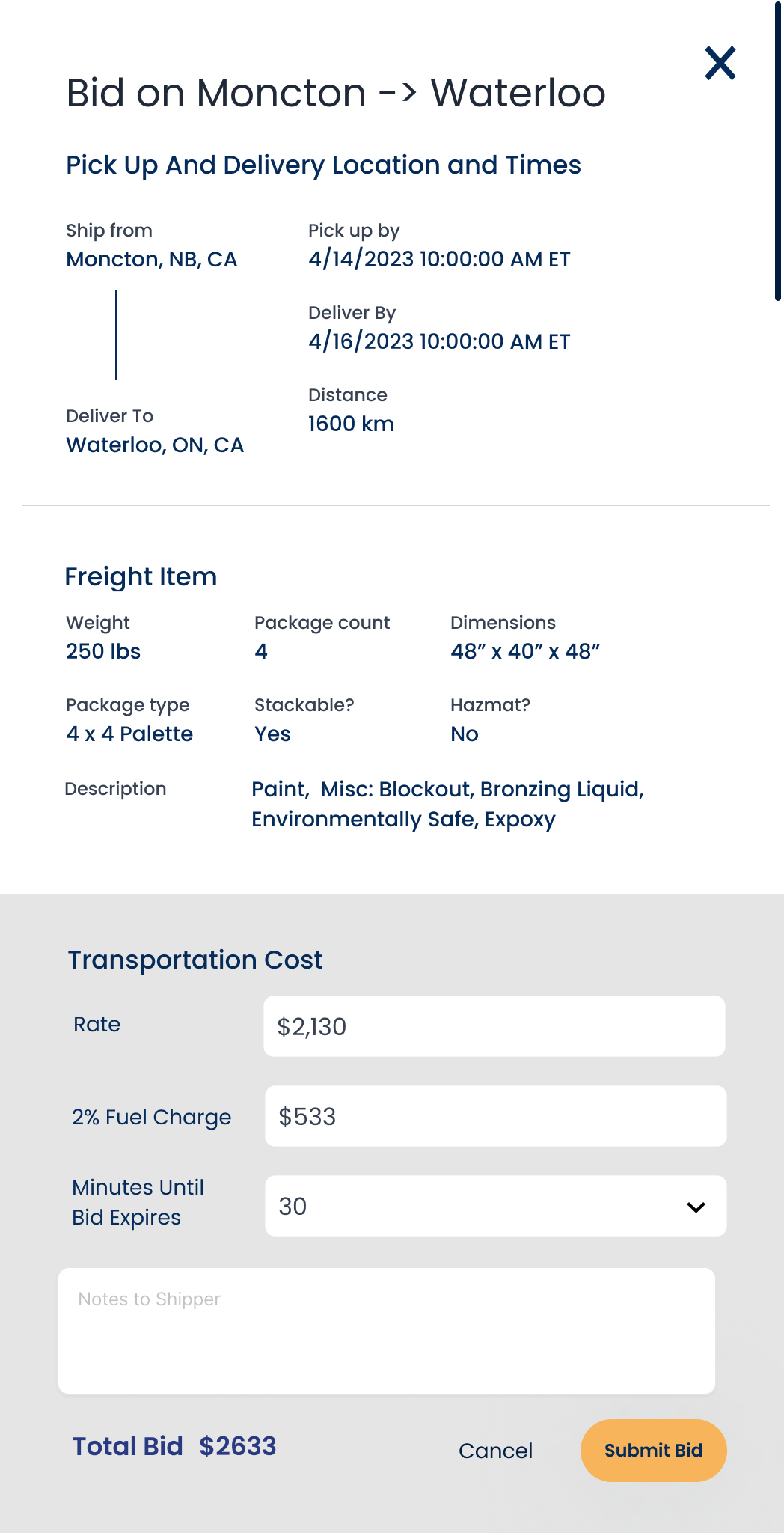 Design a slideout bid modal where users can quickly place bids on shipment while also viewing out bids.