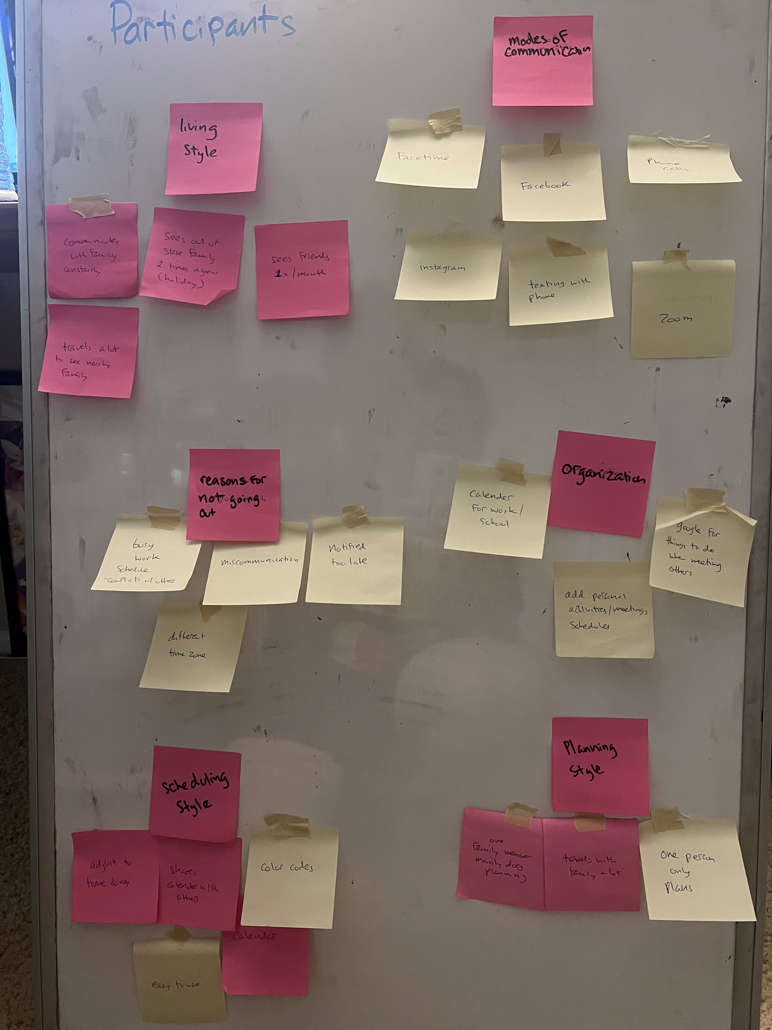 I performed user interviews on 5 different subjects. Through their interviews, I were able to synthesize the data into an affinity map to discover key themes that would help us design our social planning app. Through the user interviews, I found that users tend to keep track of appointments and plans through a calendar. It helps to send reminders and it also helps to see their availability at a glance. I also found that when users go on trips or make small plans with friends and family, it’s usually through many modes of communication (texting, calling, and even emailing) for one plan.