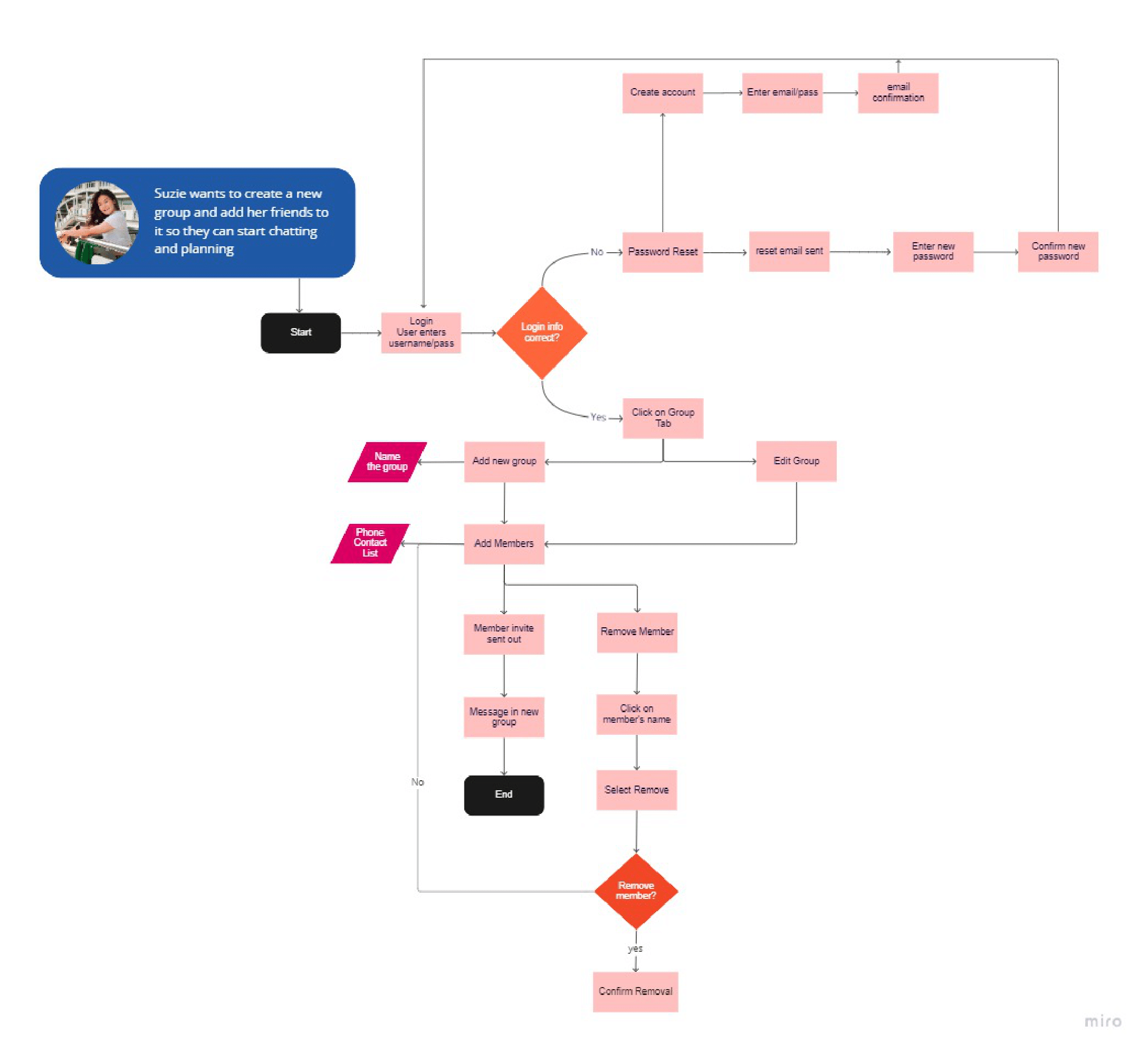I created user flows to help us understand how the app will operate and reduce the stress of navigating the app. The user flow pictured below begins at the onboarding screen and displays the steps to creating a new group and adding members to that group.